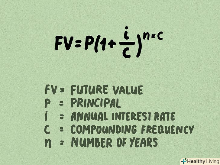 Вивчіть формулу нарахування складних відсотків. Формула складних відсотків дозволяє визначити майбутню вартість інвестиції через деяку кількість років. Виглядає вона наступним чином:. А змінні у формулі означають наступне: