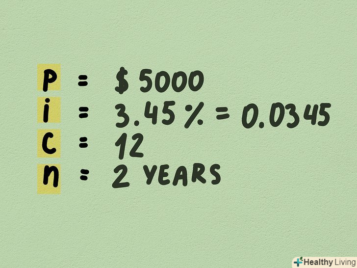 Введіть свої дані у формулу.якщо капіталізація відсотків відбувається частіше одного разу на рік, важко розрахувати складні відсотки вручну. А спеціальною формулою можна скористатися в будь-якій ситуації. Щоб застосувати формулу, спочатку зберіть зазначену нижче інформацію.[5]- Визначте початкову суму інвестиції. Це та сума, яку ви вклали. Наприклад, це може бути сума, внесена на депозит, або вихідна вартість облігації. Припустимо, що Ви внесли на депозит $5000.