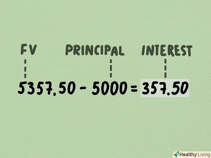 Відніміть з результату первісну суму.різниця буде представляти суму накопичених відсотків.- Відніміть початкові $5000 з майбутньої вартості вкладу $5357,50, і у вас вийде $357,50 ($5375,50-$5000=$357,50).