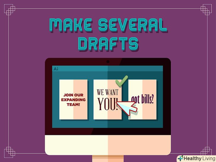 Зробіть кілька начерків, перш ніж приймати остаточне рішення.редагування необхідно при написанні тексту, і плакати також вимагають внесення деяких поправок, перш ніж ви надрукуєте остаточний варіант. Зробіть кілька версій і виберіть найбільш помітний і простий варіант. Попросіть кого-небудь висловити свою думку з приводу плаката. Це допоможе вам зрозуміти, що необхідно виправити. Продовжуйте редагувати плакат, поки не досягнете найкращих результатів.[12]