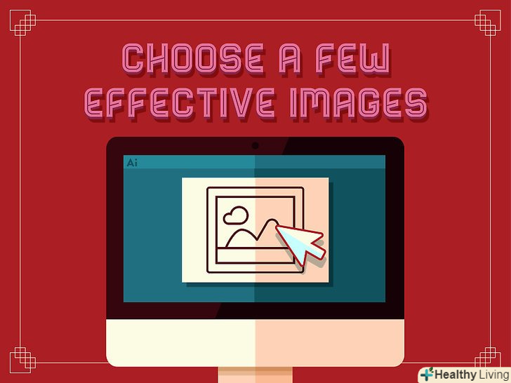 Виберіть кілька ефектних зображень.Ваш плакат не повинен бути занадто насиченим - найефектніші плакати прості. Використання великої кількості зображень завадить сприйняттю інформації. Виберіть одну або дві картинки для передачі основної інформації і розмістіть їх на передньому плані. Після цього розмістіть текст навколо зображень для залучення уваги читачів.[9]- Використовуйте зображення високої роздільної здатності. Хоча зображення з низькою роздільною здатністю будуть виглядати добре на комп'ютері, вони скоріше за все будуть розпливчастими після друку банера.