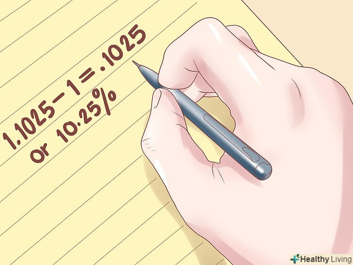 Відніміть 1 з отриманого результату. у розглянутому вами прикладі це буде 1,1025-1 =0,1025. Помножте на 100, щоб перевести в відсотки. У нашому випадку, річний дохід у відсотках становить 10,25%
