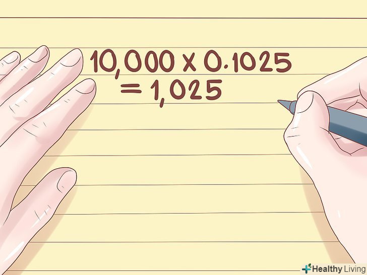 Помножте отримане значення на суму на рахунку: 10 x 0,1025 = 1,025 для визначення відсотка, що зараховується на рахунок протягом року. Наприклад, ви б заробили $1,025 і сума на вашому рахунку стала $11,025.