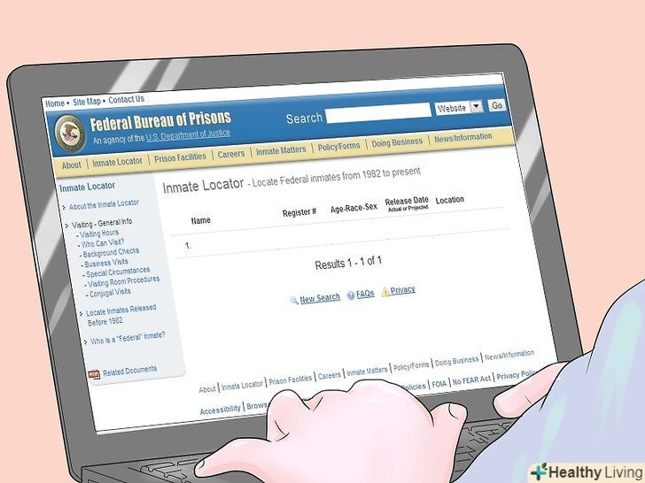 Скористайтеся сайтом Федерального управління в'язницями. даний ресурс Державний, він містить пошукову систему, розроблену для надання допомоги в отриманні інформації про затриманих. Щоб скористатися їй, необхідно як мінімум знати ім'я та прізвище заарештованого. Вони повинні бути вказані точно, без помилок.[4]- Якщо ви намагаєтеся знайти людину, поміщеного в Федеральну, а не окружну в'язницю, то найкраще відразу ж скористатися сайтом Федерального управління в'язницями. В окружній в'язниці утримують людей, які очікують суду або засуджених до ув'язнення на короткий термін (кілька днів або тижнів). У федеральній в'язниці утримуються ув'язнені засуджені рішенням суду до більш тривалого терміну.