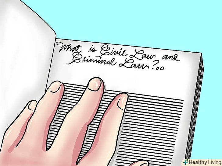 Вивчіть різницю між цивільним і кримінальним правом. Цивільне право регулює відносини між двома людьми. Якщо ви подаєте в суд на когось-це цивільна справа. Якщо вас звинувачують у злочині-це кримінальна справа.- Припустимо, що справа розглядається в США, в штаті Луїзіана. У США управління правовою системою здійснюється на базі загального англійського права.(Луїзіана є винятком, оскільки керується кодексом Наполеона)[1]
