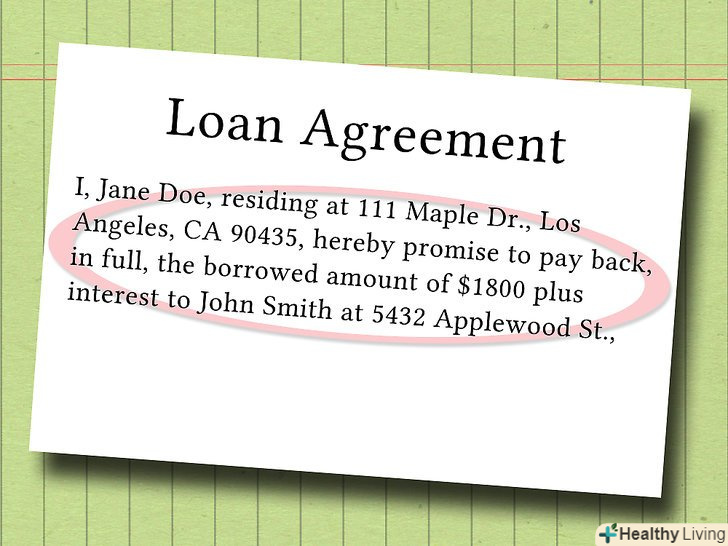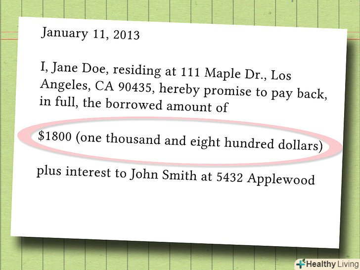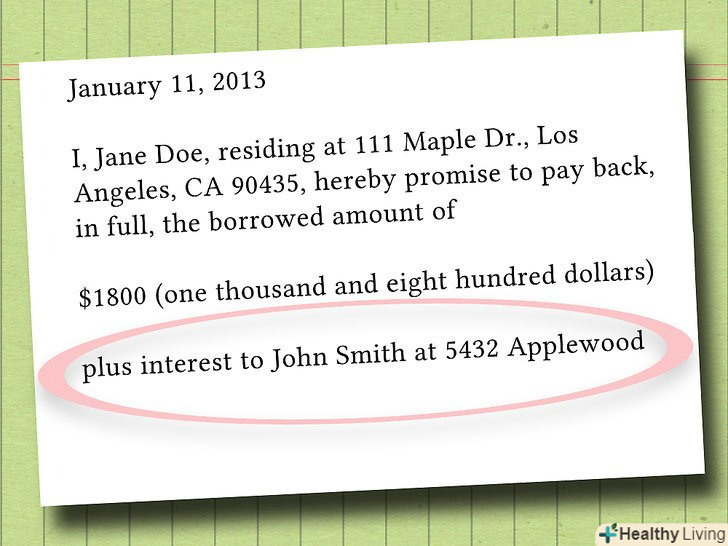 Вкажіть учасників сторін. вкажіть повні імена учасників, позначивши його або її, як "позикодавець“або "позичальник". Наприклад, " Джон До ("позикодавець „) і Джейн Сміт (“позичальник“)". Так ви зможете звертатися до учасників договору, аж до кінця всієї боргової розписки.