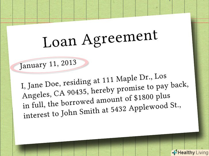 Поставте дату документа. вам найкраще вказати дату в тому ж реченні, де і вказані імена учасників і назва документа, наприклад, " Джон до ("позикодавець „) і Джейн Сміт (“позичальник“) цим укладають цей кредитний договір 5 червня 2009 року". .”