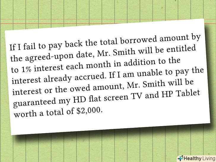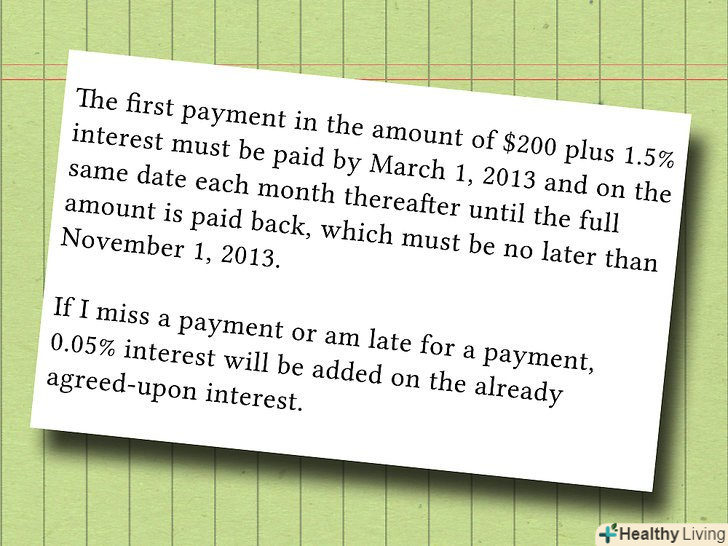 Поставте терміни виплати боргу. переконайтеся, що опишіть умови повністю і зрозумілою мовою. Ваші умови виплати повинні охоплювати:- Щомісячні платежі. Включають в себе суму знос, відсоток, і загальну суму місячного платежу, дату знос і куди саме повинна бути відправлена або доставлена.