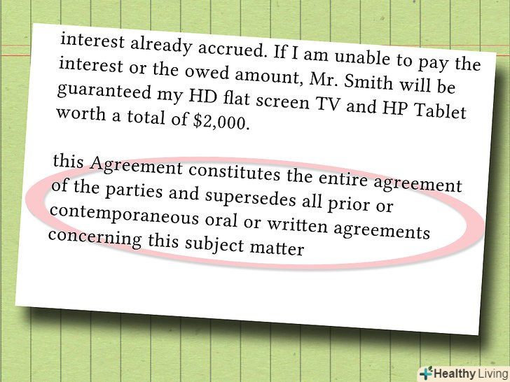 - Застава. Найчастіше позичальник повинен надати гарантію повернення боргу, в якості застави. Якщо ваш випадок вимагає такої застави, то потрібно його описати і вказати всі умови, що з ним буде робити позикодавець в разі невиплати. Опис повинен включати в себе інформацію, чи буде конфіскована власність позичальника, і в разі конфіскації, чи носить позичальник відповідальність за різницю в Сумах.