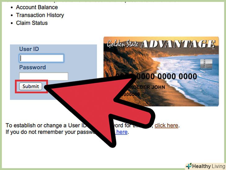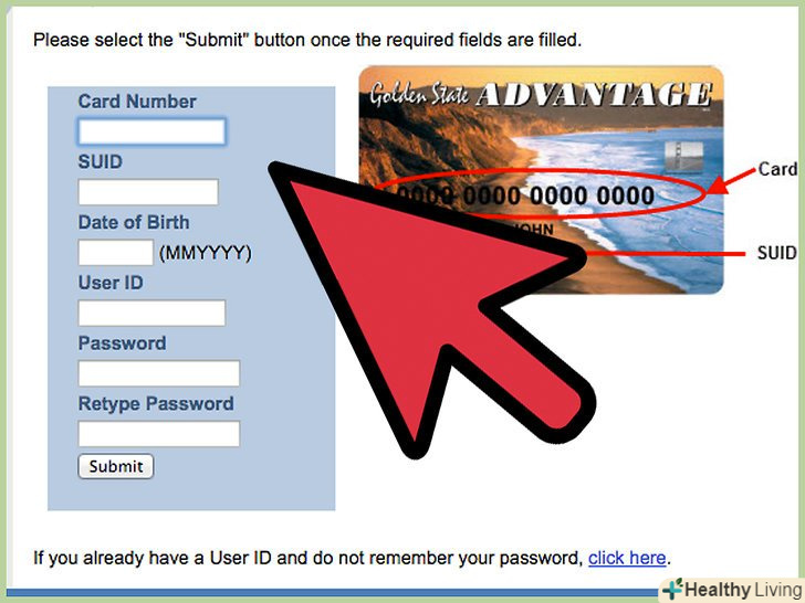 Введіть необхідну інформацію та натисніть кнопку "НАДІСЛАТИ". щоб отримати доступ до вашої допомоги, необхідно ввести своє повне ім'я та номер картки для допомоги. Також необхідно створити ім'я користувача та пароль, щоб ви могли увійти на сайт. Залежно від вашого штату, вас також можуть попросити повідомити номер соціального страхування або іншу інформацію. Заповніть форму і погодьтеся з умовами, коли з'явиться таке вікно.- Для того щоб не забути своє ім'я користувача і пароль, запишіть їх в такому місці, доступ у якому є тільки у вас.