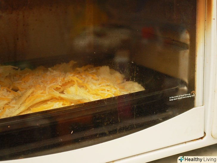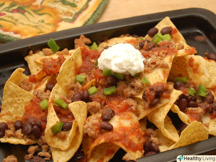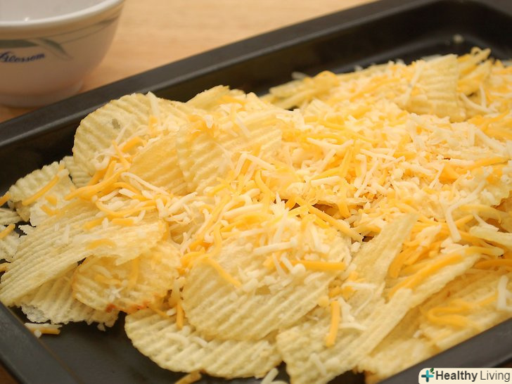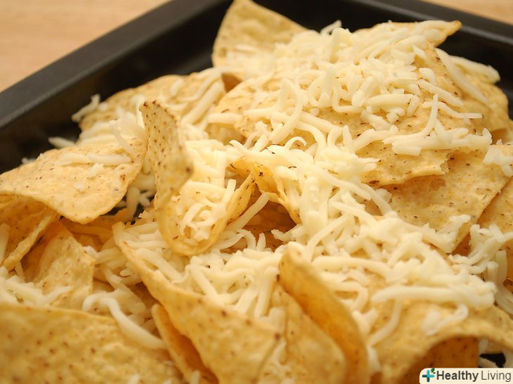 Приготуйте начос.Начос однаково смачні і приготовані в мікрохвильовій печі, і в духовці. Виберіть один з цих способів приготування:- Обсмажте в духовці з функцією гриля. Встановіть стійку духовки в 15 сантиметрах від нагрівального елементу і обсмажуйте, поки сир не розплавиться. Будьте обережні і не спаліть сир. Дістаньте і дайте охолонути протягом декількох хвилин.