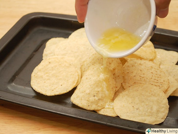 Покрийте чіпси вершковим маслом.покладіть Чіпси у велику миску і рівномірно полийте їх маслом. Щипцями акуратно пересувайте чіпси, щоб вони були покриті рівномірно.