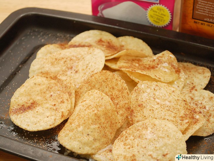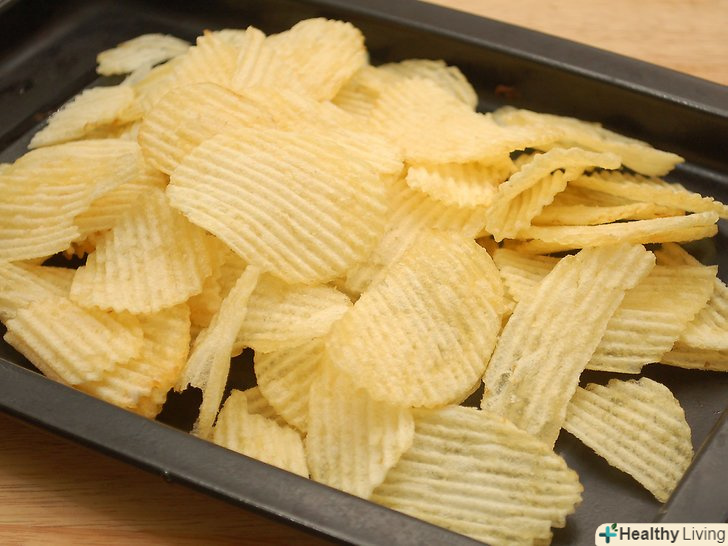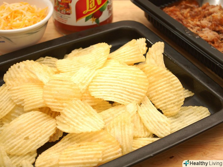 Викладіть картопляні чіпси на деко.виберіть деко, грунтуючись на джерелі тепла, наприклад, деко для духовки або блюдо, яке можна використовувати в мікрохвильовій печі. Насипте чіпси гіркою, що покриває все дно дека.