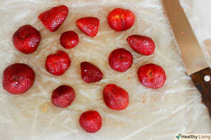 - Викладіть деко вощеним папером або паперовими рушниками. Поставте полуницю на підставу на деко. Простежте, щоб ягоди не стикалися.