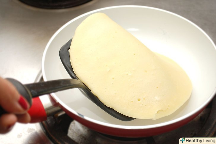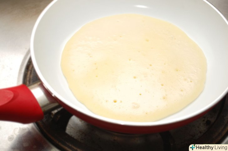 Переверніть млинець і готуйте його ще кілька секунд.немає необхідності засмажувати нижню сторону млинця до коричневої скоринки, проте її необхідно підсушити. Можна і пропустити цей крок в приготуванні млинця, проте в цьому випадку доведеться засмажувати першу сторону сильніше до золотисто-коричневої скоринки, а верх повинен бути сухим і в дірочку.