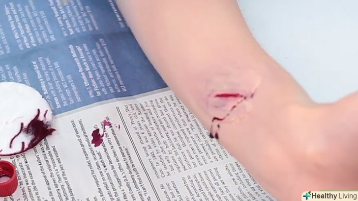 Покажіть, як кров тече з вашої рани.для цього вам знадобиться тонка трубочка з грушею, яку можна купити в аптеці або в зоомагазині.[12] наповніть грушу підробленою кров'ю, а потім вставте трубочку в грушу. Сховайте грушу під сорочкою або під підробленою шкірою з желатину, а кінець трубки помістіть в центрі рани. Стисніть грушу, щоб штучна кров витікала з трубочки.- При виборі підробленої крові звертайте увагу на етикетку. Штучна кров з малою в'язкістю більше схожа на справжню кров.[13]