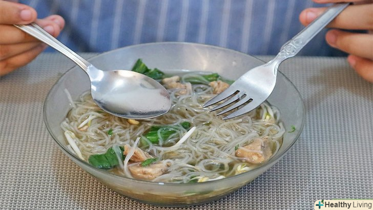 Використовуйте столову ложку і вилку, щоб їсти.у закладах західних країн використовують супову ложку. У деяких ресторанах разом з супом вам подадуть відповідну ложку. На вилку можна намотувати локшину і наколювати інші інгредієнти, такі як м'ясо або овочі.[8]- У британській та американській культурах крайня права ложка є столовим приладом для супу. У деяких випадках можна виявити праворуч від супової ложки вилку для морепродуктів / устриць.[9]
