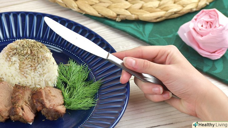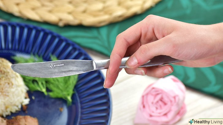 Щоб розрізати блюдо на вашій тарілці, візьміть ніж в праву руку.вказівний палець повинен лежати прямо і розташовуватися біля основи тупий боку леза ножа. Решта чотири пальці охоплюють ручку.[2] у той час як вказівний палець розташовується на одній стороні ножа (тупий стороні), великий палець притримує ніж з іншого боку (за ручку). Кінець ручки ножа повинен стосуватися підстави вашої долоні.- Ніж використовується однаково в обох стилях. Правила розраховані на правшів в обох стилях. У разі якщо ви лівша — дотримуйтесь представленої інструкції, враховуючи вашу особливість (таким чином, ніж ви будете тримати в лівій руці, а вилку в правій).