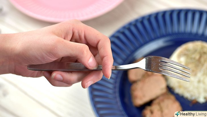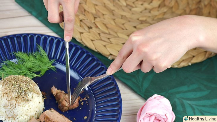 Коли ви відрізаєте, тримайте ніж у правій руці.[5] розташування пальців правої руки таке ж як і в попередньому варіанті — вказівний палець уздовж основи, інші — охоплюють ручку.- Відріжте їжу.тримайте шматок виделкою (зуби звернені вниз), акуратно відрізаючи їжу пиляють рухами. Вилка повинна бути ближче до вас, ніж до ножа. Відріжте один-два шматки, перш ніж продовжити.