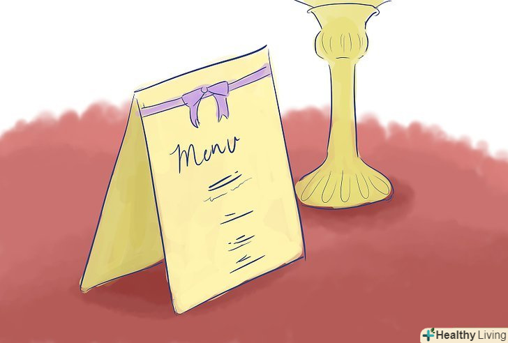 Складіть меню в письмовому вигляді (за бажанням).як тільки ви визначитеся зі стравами, розгляньте ідею створення симпатичного меню. Меню можна покласти на стіл, щоб ваш партнер зміг його перегорнути. Запишіть назву кожної страви, які трохи нижче можна доповнити короткими описами основних інгредієнтів. Таке меню часто пропонують в ресторанах.