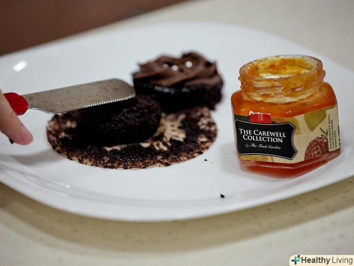 Намажте джем або інший наповнювач на низ.використовуйте тупий ніж, щоб розподілити тонкий шар джему, меду, горіхової пасти або інших схожих продуктів на тій стороні нижнього шару, яка була зрізана.- Ви можете використовувати більш товстий шар пасти, але більш товстий шар швидше за все витече з капкейку, поки ви будете його їсти.