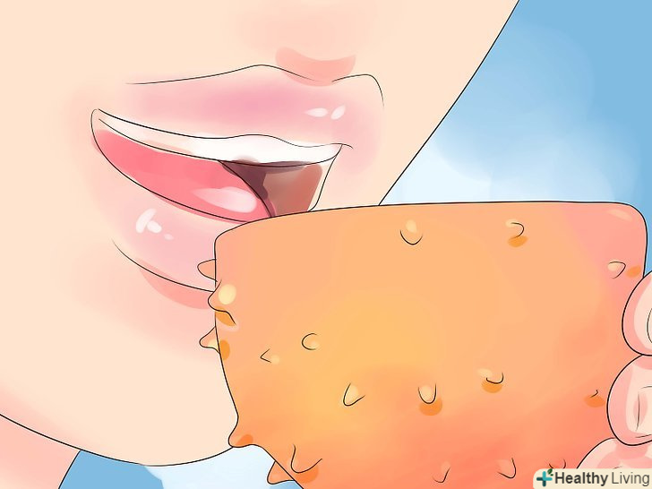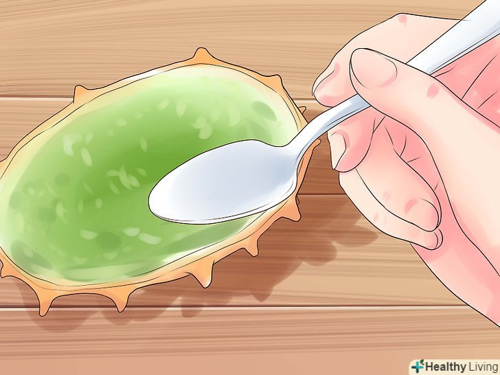 З'їжте насіння. як у граната, насіння у ківано їстівні, хоча і невиразні на смак. Вас більше цікавить солодка Зелена м'якоть навколо насіння. Ви можете брати їх в рот по одному, відокремлювати м'якоть і випльовувати насіннячко, або брати повний рот і жувати.- Якщо вам не подобаються насіння, спробуйте обережно затиснути мішечок з м'якоттю передніми зубами. Можете висмоктати його крізь зуби, стиснувши їх досить, щоб між ними пройшла тільки м'якоть, а насіннячко залишилося зовні.