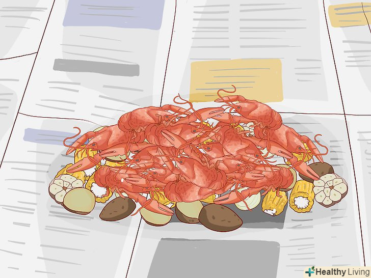 Подавайте блюдо на стіл.накрийте газетою столи для пікніка або будь-які інші столики, приготовані вами. Викладіть овочі прямо на стіл, а зверху лангустів. Роздайте гостям паперові тарілки.- Подбайте про додаткову кількість спецій, хліба та інших приправ за бажанням.