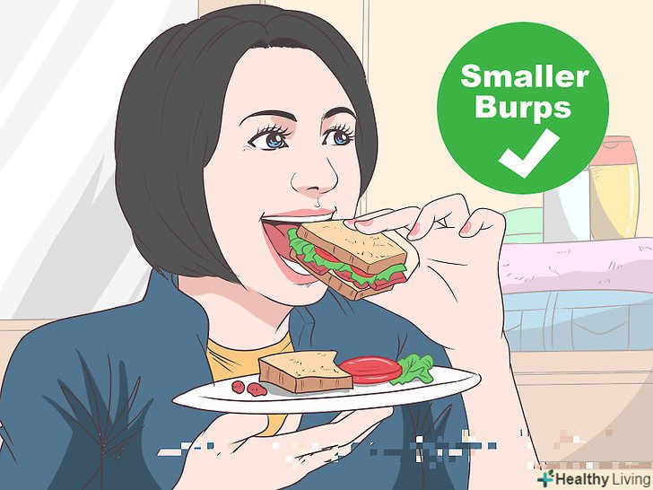 З'їжте який-небудь делікатес.використовуйте цю техніку, коли вам потрібно відригнути, але ви хочете зробити це настільки тихо, наскільки тільки можна (наприклад, на офіційному вечері). Цей крок превентивний-менша кількість їжі та напоїв призводить до тихої відрижки.[7]