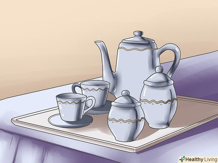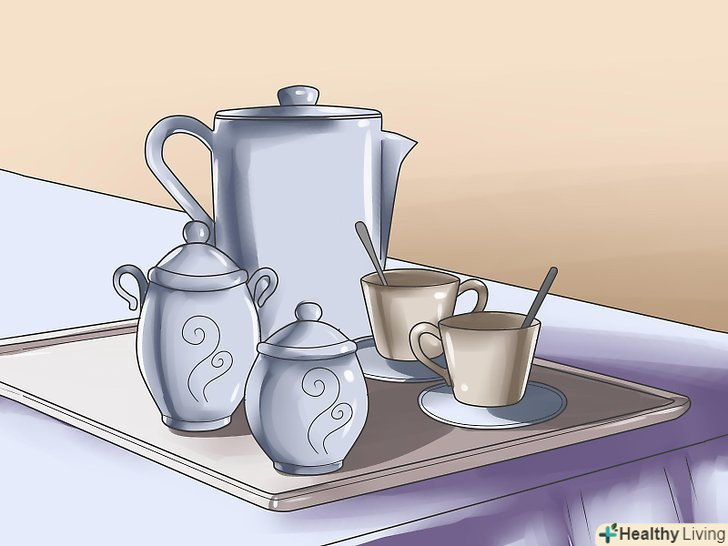 З іншого боку столу поставте кавник, глечик з гарячим шоколадом або ще один чайник для заварювання з чаєм.кава і гарячий шоколад подаються тільки в тому випадку, якщо хтось із гостей не любить чай, якщо ж ви впевнені, що всі ваші гості п'ють чай, значить, можна обмежитися тільки чаєм, але приготуйте кілька сортів.- Поставте все необхідне для чаювання з двох сторін столу. Там, де буде стояти тільки кавник, поставте лише цукорницю і вершки/молоко.