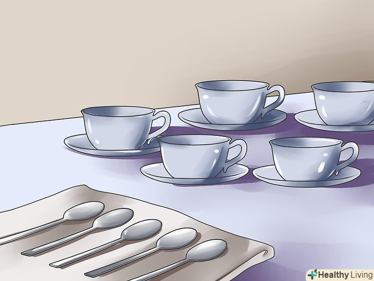 Підготуйте невеликі тарілки, чашки і ложки.якщо ваші гості будуть сидіти, подивіться в попередньому розділі, як оформити місце кожного гостя. Якщо це буде «шведський стіл», розставте посуд з одного боку столу, якщо дозволяє місце – з двох. Підготуйте кожному гостю мінімум одну чашку, одну тарілку і одну чайну ложку. Але підготуйте кілька запасних чашок і тарілок – на випадок, якщо щось розіб'ється, або якщо прийдуть ще гості.- Якщо у вас вдома немає необхідної Вам кількості чашею, позичте кілька чашок у сусідів, або попросіть гостей, щоб вони прийшли зі своїми чашками. Якщо ви попросите, то ваші гості, швидше за все, принесуть з собою з дому свої улюблені чашки, але все одно нехай у вас буде кілька чашок про запас.[11]