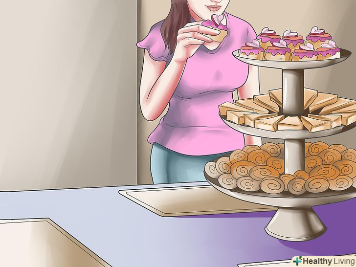 У центрі столу поставте солодкі і несолодкі страви. найчастіше використовують такі солодкі страви – печиво, тістечка, булочки, зефір, і несолодкі – бутерброди, яйця і т. д. [12]- Якщо ви використовуєте трирівневу підставку для торта, то на верхній рівень покладіть випічку, на середній – несолодку закуску, на нижній – солодощі.[13]