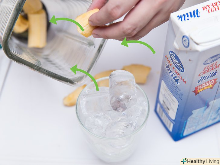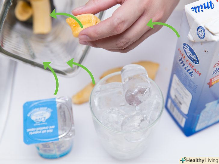 Додайте банани, кубики льоду і молоко в чашу блендера.завдяки кубикам льоду у вас вийде більш густий напій. Якщо ви використовуєте заморожені банани, можна не додавати кубики льоду.