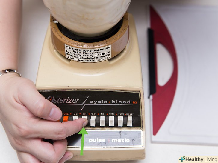 Подрібніть інгредієнти в чаші блендера до пюреобразного стану, приблизно 1-2 хвилини.зверніть увагу на те, що не повинні потрапляти шматочки банана або льоду. Суміш повинна бути однорідною. Періодично відкривайте блендер і, використовуючи лопаточку, зчищайте неподрібнені інгредієнти зі стінок чаші. Завдяки цьому у вас вийде суміш однорідної консистенції.