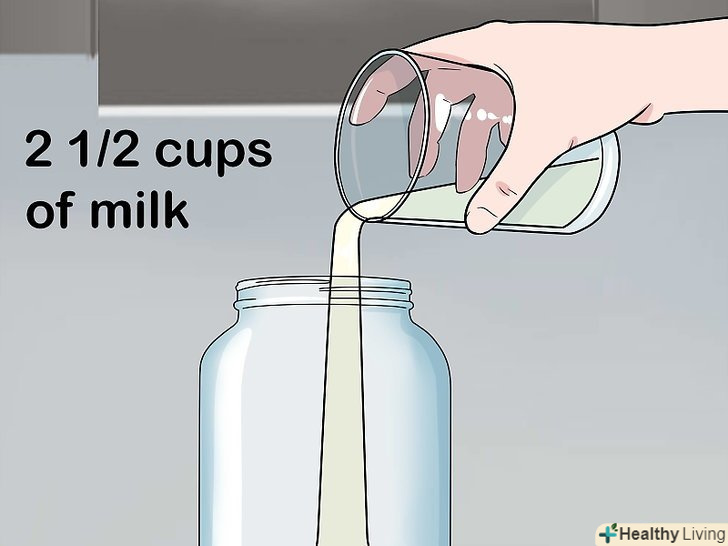 Налийте в банку 2 1/2 склянки молока.знову ж таки, скільки наливати молока буде залежати від вашого смаку, але 2 1/2 чашки чудово підійдуть для початку. Не заповнюйте всю банку до верху, так як суміші потрібно простір, щоб дихати в процесі ферментації. Заповніть банку на дві третини.