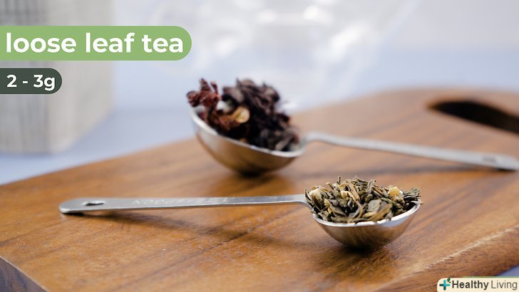 Відміряйте листя чаю з розрахунку 2-3 грами на кожні 180 мілілітрів води.листя чаю мають різну форму і розміри, тому краще вимірювати їх за вагою, а не за обсягом.[4] проте, якщо ви берете листя за обсягом, для початку візьміть приблизно 1 чайну ложку (5 мілілітрів) дрібних або 1 столову ложку (15 мілілітрів) порівняно великих листя. Покладіть потрібну кількість листя в ситечко або чайник для заварювання, в залежності від того, в чому ви збираєтеся заварювати чай.- Звичайна чайна чашка відповідає приблизно 180 мілілітрів води, проте великі гуртки вміщують 300-350 мілілітрів, і якщо ви використовуєте таку кухоль, візьміть удвічі більше листя чаю.