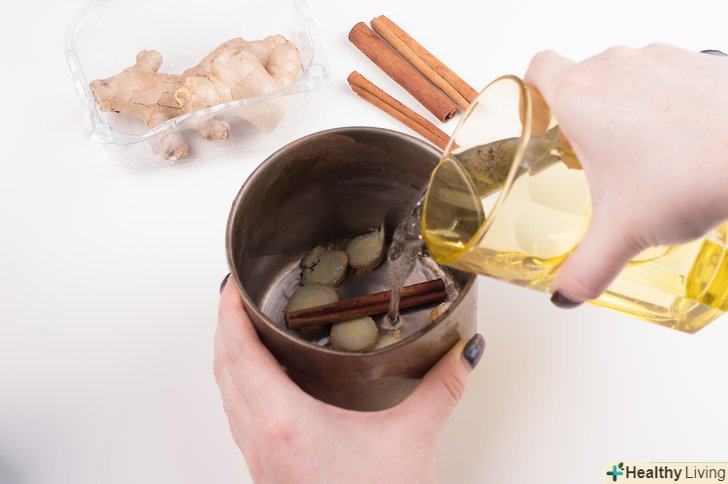 Додайте в ємність корицю, імбир і воду.додайте 3 літри води, 2 палички кориці і ¾ склянки (40 грамів) очищеного, подрібненого імбиру у велику каструлю. Накрийте ємність кришкою і поставте на плиту.[9]- Для більш насиченого аромату кориці розламайте паличку на кілька частин.