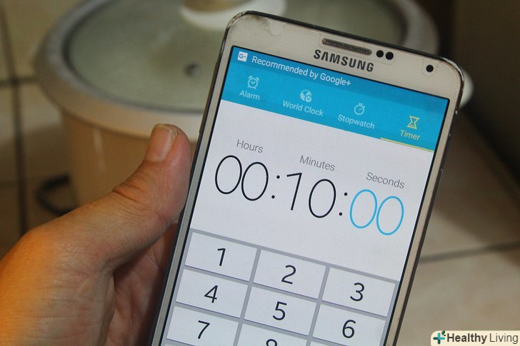 Залиште рис хоча б на 10 хвилин.коли жасминовий рис звариться, вимкніть рисоварку, але при цьому не поспішайте діставати рис з ємності. Замість цього залиште його в рисоварці на 10-15 хвилин.[10]- Не знімайте кришку з рисоварки, поки рис "відпочиває".