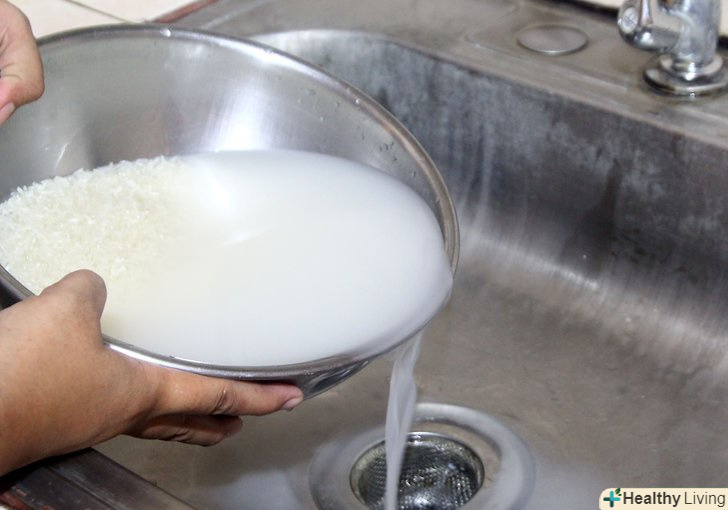 Вилийте воду в останній раз.після того як ви перемішаєте рис вдруге, знову вилийте вміст миски в друшляк або сито, щоб зцідити воду. Гарненько струсіть рис, щоб видалити зайву вологу.[5]- Якщо після другого полоскання вода все ще виглядає дуже каламутною, повторіть промивку ще раз. Продовжуйте промивати рис, поки вода не стане чистою.