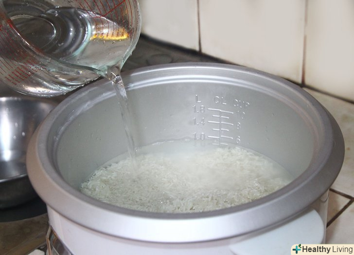 Додайте рис і воду в рисоварку.помістіть промитий рис в ємність рисоварки. Потім залийте його 1 склянкою (240 мл) чистої холодної води.[6]- Для приготування жасминового рису використовуйте співвідношення рису і води 1:1. Збільште кількість кожного з інгредієнтів в залежності від кількості людей. Однієї склянки (185 г) жасминового рису і однієї склянки (240 мл) води буде достатньо для приготування 4-6 порцій рису.