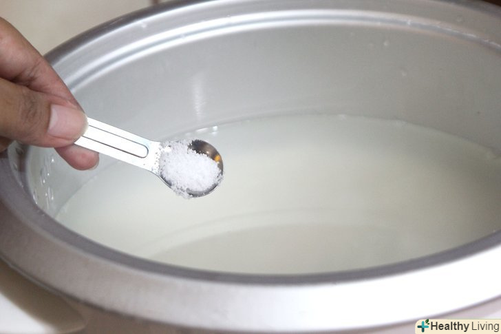 Залиште рис розм'якшуватися протягом години.після того, як ви змішаєте в рисоварці рис, воду і сіль, накрийте її кришкою і залиште рис відмокати протягом години. Це дасть йому час розм'якнути, щоб він мав більш приємну текстуру по закінченню готування.[8]
