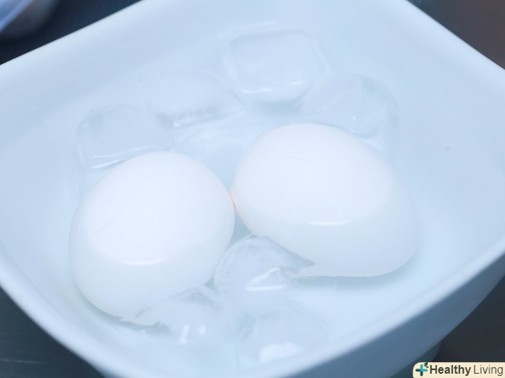 Охолодіть яйця, щоб зупинити процес приготування.після того, як яйця полежать в гарячій воді необхідний час, обережно вилийте гарячу воду з каструлі. Акуратно перекладіть яйця в миску з крижаною водою, щоб зупинити процес приготування. Дістаньте яйця одне за іншим за допомогою шумівки, щоб уникнути появи тріщин на шкаралупі. Обережно опустіть яйця в миску з крижаною водою, щоб знизити їх температуру. Дайте їм охолонути протягом 2-5 хвилин.