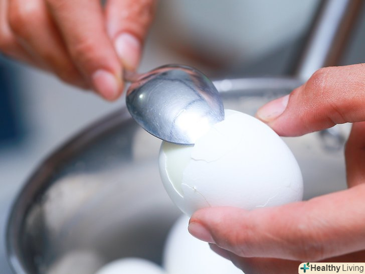 Використовуйте чайну ложку, щоб акуратно почистити яйце.постукайте по шкаралупі яйця з широкого кінця, щоб зруйнувати повітряну кишеню. Помістіть ложку між шкаралупою і самим яйцем, прокрутіть його, і ви швидко почистіть яйце.