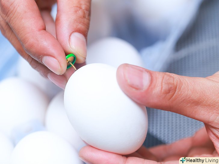Зробіть невеликий прокол голкою або канцелярською кнопкою, щоб повітря вийшло.перед тим, як ви занурите Яйце у воду, зробіть невеликий прокол з боку тупого кінця яйця голкою або канцелярською кнопкою, щоб повітря вийшло. Зробивши голкою отвір з боку тупого кінця яйця, ви побачите струмінь повітря, кучеряву з отвору. Завдяки цьому при нагріванні шкаралупа не трісне.[2]