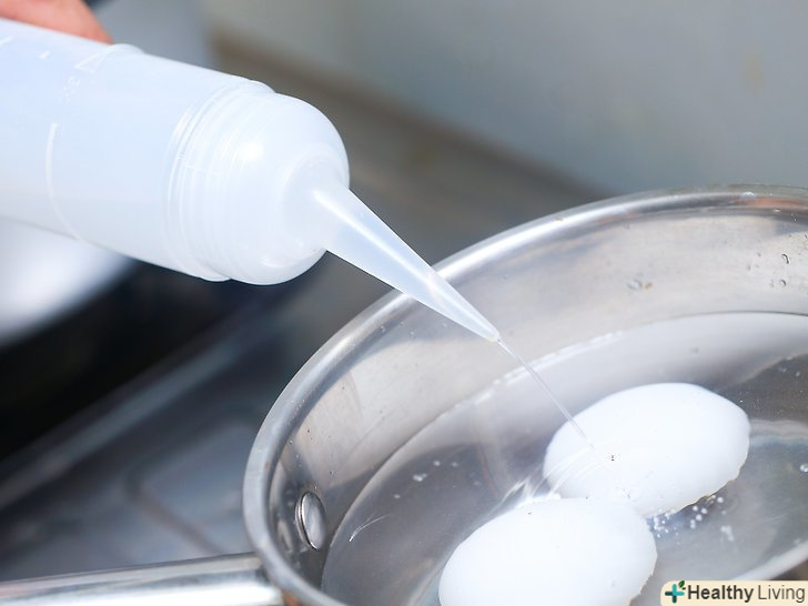 Додайте оцет у воду.використовуйте одну чайну ложку оцту для кожного яйця. Налийте оцет у воду, перш ніж включати плиту. Оцет сприяє більш швидкому згортанню білка, який, не встигнувши витекти, закупорить отвір тріщини.[4] це часта проблема, особливо якщо ви варите дуже холодні яйця.- Ви також можете додати оцет, якщо бачите тріщину на шкаралупі яйця. Ви можете помітити білу рідину, що просочується з потрісканого яйця. Дійте якомога швидше. Якщо ви додасте оцет у воду, як тільки помітите тріщину, білок не витече.
