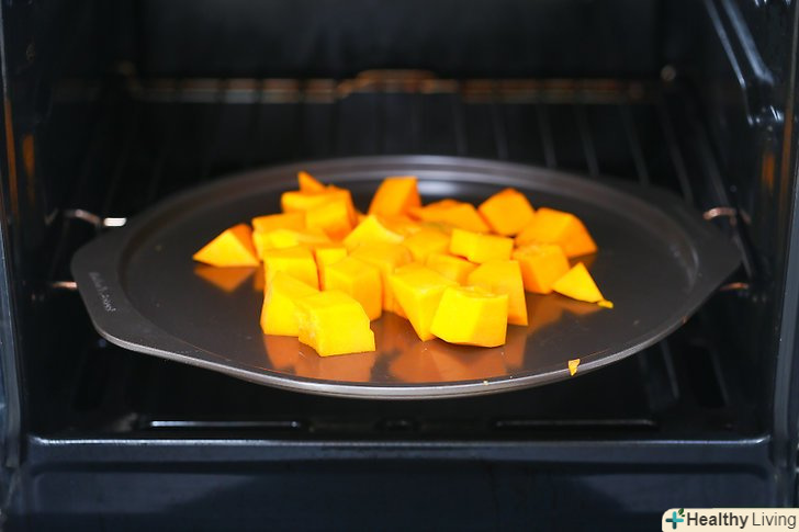 Приготуйте запечені шматочки мускатної гарбуза.щоб їх запекти, заправте кубики оливковою олією, сіллю і перцем. Запікайте шматочки в духовці при 350 градусів за Фаренгейтом. Коли шматочки будуть м'якими всередині і коричневі і хрусткі зовні - можна діставати їх з духовки.- Додайте солоні спеції такі, як кмин, мелений червоний перець або кайенский перець, щоб блюдо вийшло пікантним.