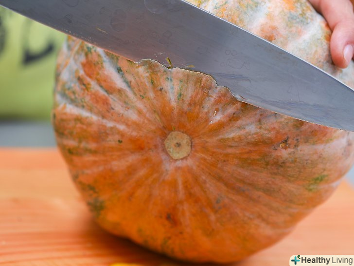 Відріжте верхівку.покладіть гарбуз на велику обробну дошку. Однією рукою тримайте гарбуз за більш товстий кінець, іншою рукою відріжте приблизно 1.2 см від більш тонкого кінця, прямо біля стебла. Зріз повинен бути чистим і гладким.