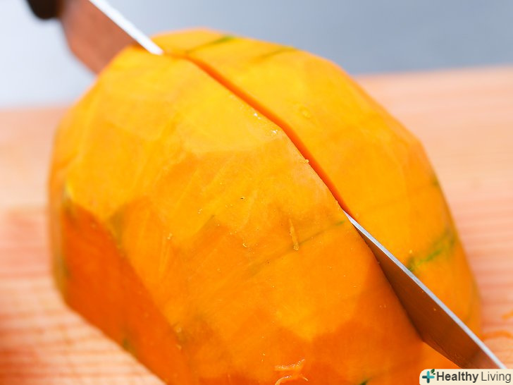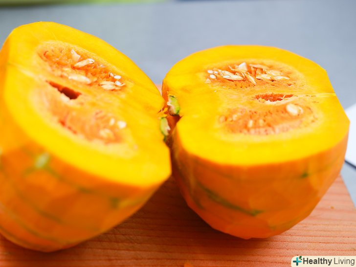 Розріжте гарбуз навпіл.покладіть гарбуз на широкий кінець. Застроміть ніж в центральну частину верхівки і розріжте гарбуз навпіл. Зробіть один чистий зріз.- Часом не так легко розрізати гарбуз навпіл, так як вона щільна і жорстка. В цьому випадку постукайте по ножу гумовим молоточком, щоб допомогти розрізати м'якоть гарбуза.
