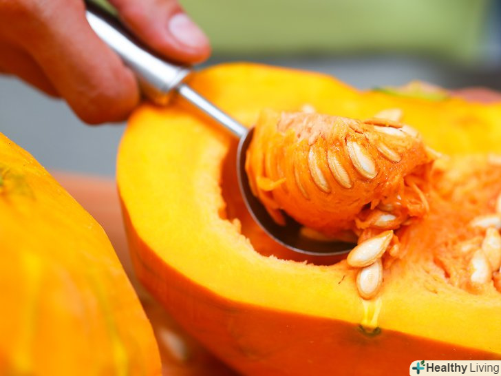 Видаліть насіння і волокна.за допомогою металевої ложки видаліть насіння і липкі волокна з обох половинок гарбуза. Насіння можна залишити і підсмажити.