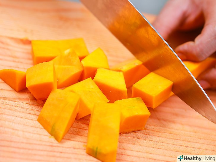Розріжте поздовжні брусочки хрест-навхрест.ви можете залишити їх поздовжніми смужками, а можете порізати поперек, щоб вийшли кубики. .- Якщо ви хочете заощадити трохи часу, тоді покладіть кілька шматочків гарбуза один на одного і розріжте їх одночасно. Якщо ви будете використовувати дану техніку, будьте обережні, щоб шматочки не зісковзували, інакше ваші кубики вийдуть неоднаковою форми.