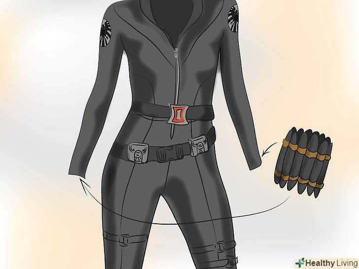 Візьміть кілька хороших браслетів.на обох зап'ястях у неї "нитка вдови" - її головна зброя. Ці браслети викликають смертельний електричний розряд. Можете їх зробити-купіть дешеву стрічку пластикових патронів в магазині карнавальних костюмів, які продаються з військовими нарядами. Часто кулі не прикріплені одна до іншої. Роз'єднуйте дві секції, достатньо великі, щоб обернути навколо зап'ястя і пофарбуйте їх чорною (як у фільмі) або золотою (як у коміксі) фарбою. Якщо не можете знайти кулі, зробіть самі, згорнувши смужки паперу, шириною приблизно 5 см, і досить довгі, щоб надати їм форму кулі. Після того, як пофарбуєте, використовуйте пружну нитку і голку, щоб закріпити їх.